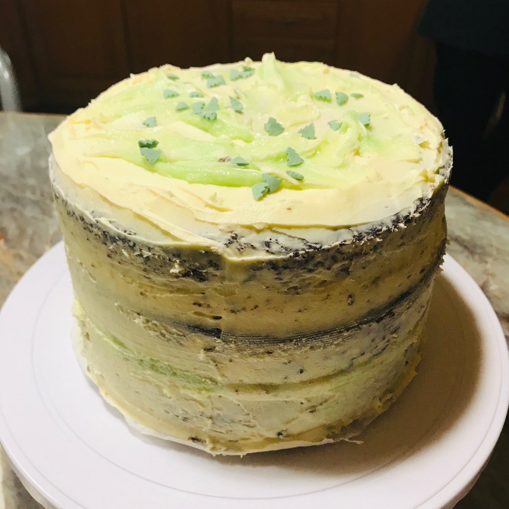 Mint Buttercream frosting and Chocolate Crazy cake, plus an outer layer of any type of Vanilla frosting. Mint Chocolate “Naked” Cake. I doubled the cake recipe and used a medium sized springform and my cake strips, which made them flat topped! A naked cake is basically like a crumb coat, but you don’t put anything else on it!