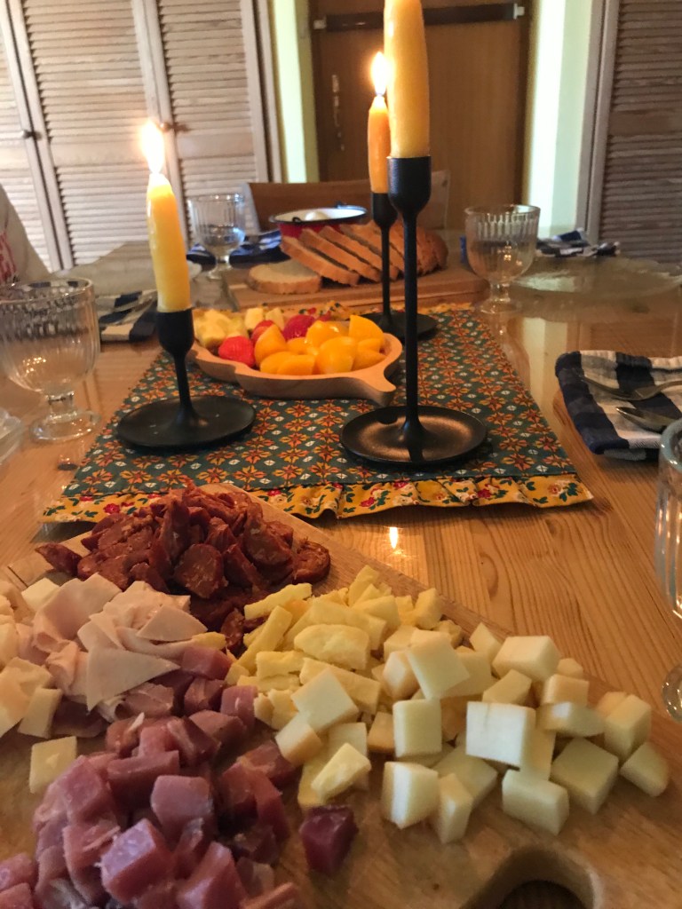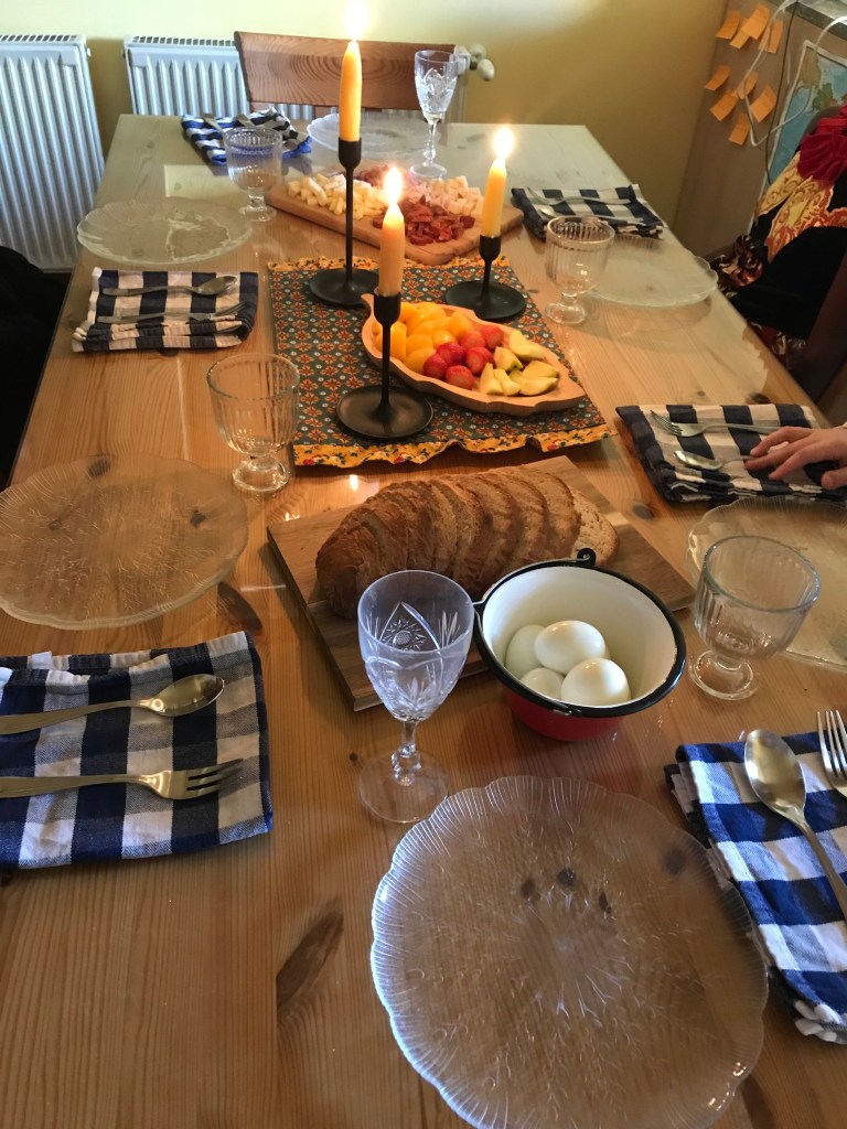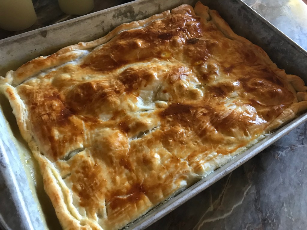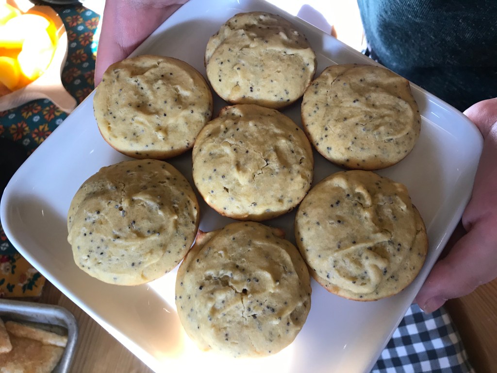 And here’s a couple pictures! Biggest Picture; Pork Pot Pie, covered in a sheet of puff pastry. Smaller picture to the right; Lemon Poppyseed cakes. Under the cakes and also to the right; Our table!