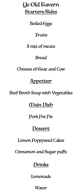 For history in school right now we are learning about the medieval period in time. I really like to cook, but I also like to learn about what they cooked way back when. So I asked my parents if I could plan a medieval style dinner for our family, and I did! It was amazing, I will post the recipes later if I haven’t already. Here’s our menu!