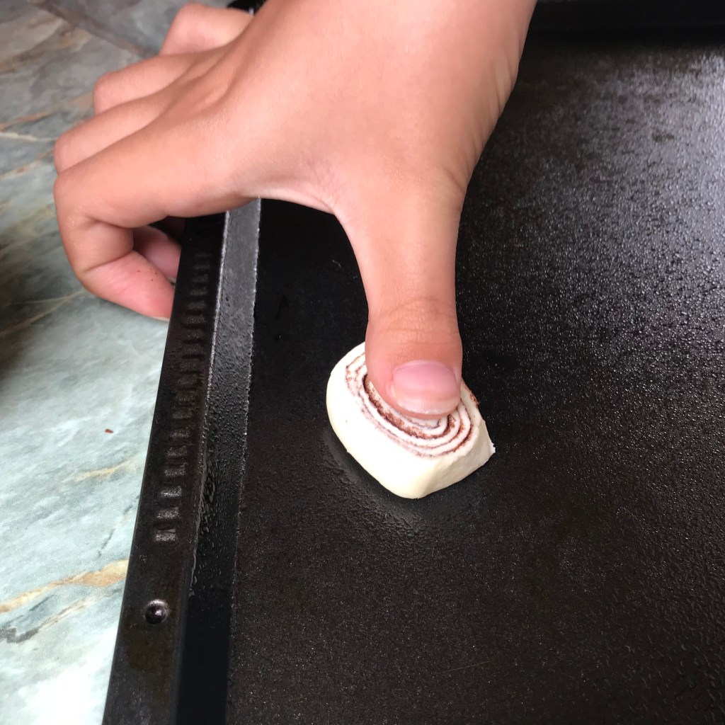 Then place each spiral slice on the cookie sheet and lightly press down with your fingers. If you need to, reshape the spiral slice to be more of a circle.